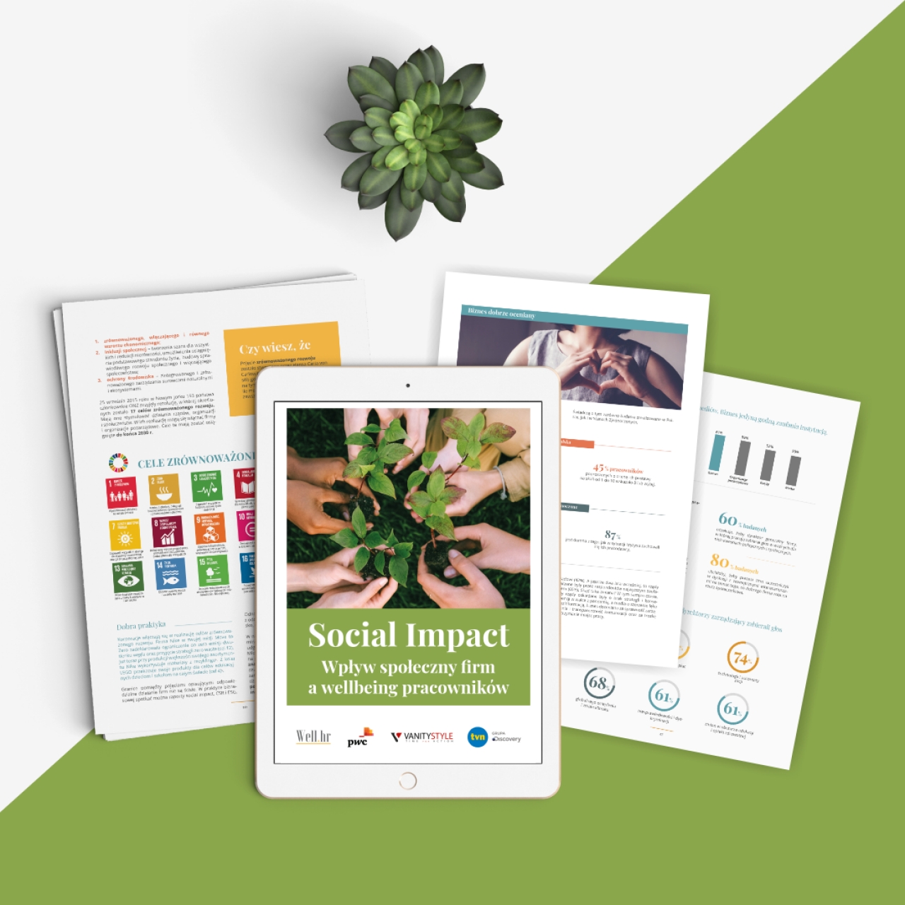 Raport pt. „Social impact. Wpływ społeczny firm a wellbeing pracowników” to kompleksowy przewodnik po tematyce wpływu społecznego. Zawiera on informacje o trendach, które sprawiły, że social impact jest dziś tak ważny, przedstawia dowody na to, że odpowiedzialne działania firm przekładają się na wellbeing pracowników. Autorzy raportu dzielą się wynikami badań i setkami dobrych praktyk. Podpowiadają, jak budować zaangażowanie pracowników w wolontariat i podają przykłady firm, które postępują odpowiedzialnie wobec planety, społeczności i pracowników. Partnerami raportu są firmy PwC. TVN Discovery i VanityStyle, a jej sponsorem Fundacja ORLEN. Raport jest dostępny w dwóch wersjach językowych – polskiej i angielskiej - na stronie: https://wellbeingposwojemu.pl/social-impact.