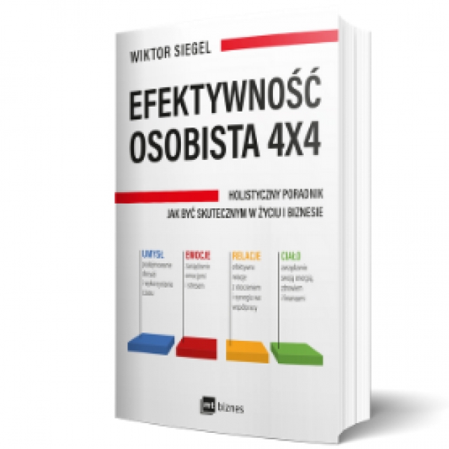 Dlaczego większość porad dotyczących naszej efektywności i produktywności nie przynosi oczekiwanego efektu? Ponieważ traktują je wycinkowo i nie pokazują współzależności pomiędzy ich różnymi wymiarami. Tymczasem właściwie dobrana aktywność fizyczna może znacząco zwiększyć efektywność intelektualną i emocjonalną, a jej brak – obniżyć zdolność koncentracji i odporność psychiczną. Wiktor Siegel, lekarz medycyny, a także mentor i trener, który od ponad 20 lat zajmuje się zawodowo efektywnością osobistą, podjął się holistycznego spojrzenia na nasze ciało i umysł i zależności między nimi. Jego książka Efektywność osobista 4x4 pozwala uwolnić się od nadmiaru zadań do wykonania, chronicznego stresu, złych relacji, jak również skończyć z niezdrowym stylem życia.