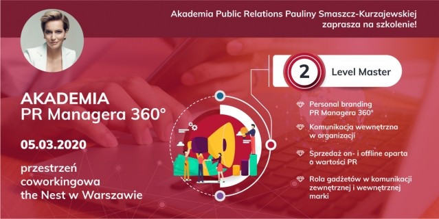 Kolejne szkolenie, czyli Akademia PR Managera 360° - LEVEL MASTER odbędzie się w czwartek, 5 marca, w godz. 9:30 - 18:00, w przestrzeni coworkingowej the Nest w Warszawie (ul. Piękna 49).