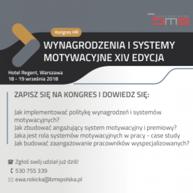 Zapraszamy serdecznie do udziału w corocznie organizowanym przez BMS Group wydarzeniu KONGRES HR - Wynagrodzenia i Systemy motywacyjne.