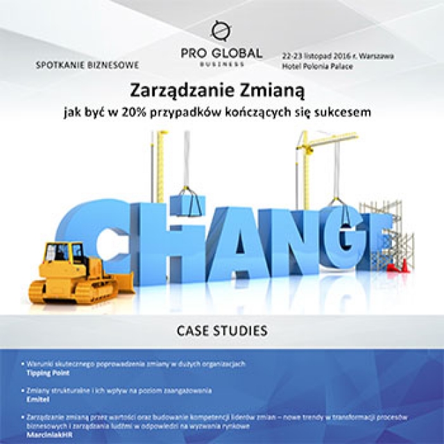 Zmiana jest nieunikniona. Jak śmierć i podatki. Jest jedną z kilku pewnych rzeczy w życiu. Jakie warunki muszą zostać spełnione, żeby przeprowadzić zmianę z sukcesem? Jak być w 20%, którym to się udaje? Zapraszamy na spotkanie biznesowe pt. „Zarządzanie zmianą - jak być w 20% przypadkach kończących się sukcesem", które odbędzie się 22–23 listopada w warszawskim hotelu Polonia Palace.