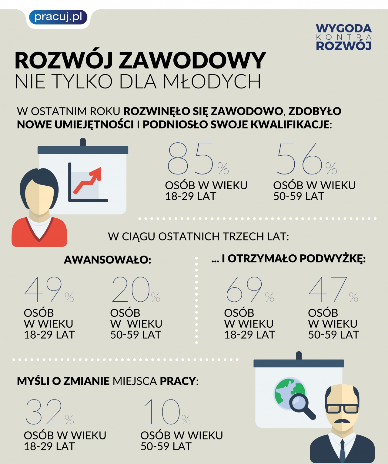 Jak wynika z raportu „Wygoda kontra rozwój”, większość aktywnych zawodowo Polaków w wieku od 18 do 29 lat deklaruje, że w ostatnim roku rozwinęło się w pracy, zdobyło nowe umiejętności i podniosło swoje kwalifikacje zawodowe. Mimo istotnych zmian, jakie zachodzą na rynku pracy, odsetek dla tej grupy wiekowej pozostaje znacząco wyższy niż w przypadku osób starszych.
